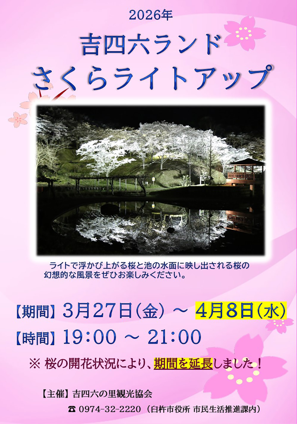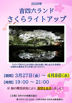 今年の寒暖の変化はいつまで続くでしょうか。 以下の日程にて吉四六ランドのさくらライトアップを実施いたします。 夜空に舞う桜の花びらも良いものですよ。 期間限定となります、ぜひご来場ください。